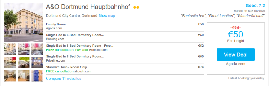 9. Дортмунд, готель A&O Dortmund Hauptbahnhof, ціна 50€ за двомісний номер за добу