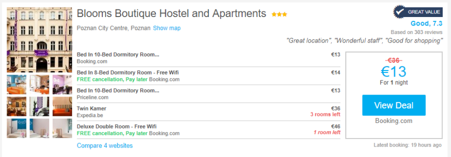 1. Познань, хостел Blooms Boutique Hostel and Apartments, ціна 12€ за двох за добу