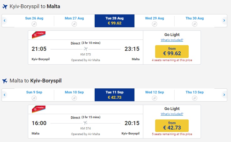 Ірландський лоукостер продає квитки на рейси Київ (Бориспіль) – Мальта, які виконує авіакомпанія Air Malta, пише ЦТС. Доступні квитки в обидві сторони починаючи з вівторка 28 серпня. Ціна перельоту з Києва на Мальту в цей день складе 100 євро, в зворотному напрямку – 104 євро. Якщо ж повертатися з Мальти до України, наприклад, 11 вересня, то це можна зробити за 43 євро.
