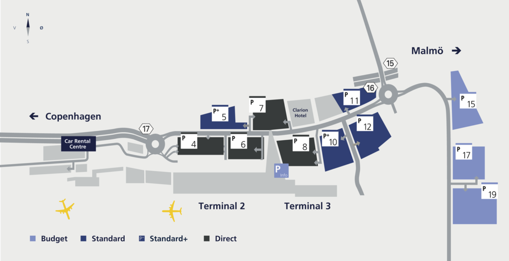 Розташування паркінгів класу Standard+ на території аеропорту Копенгагена:
