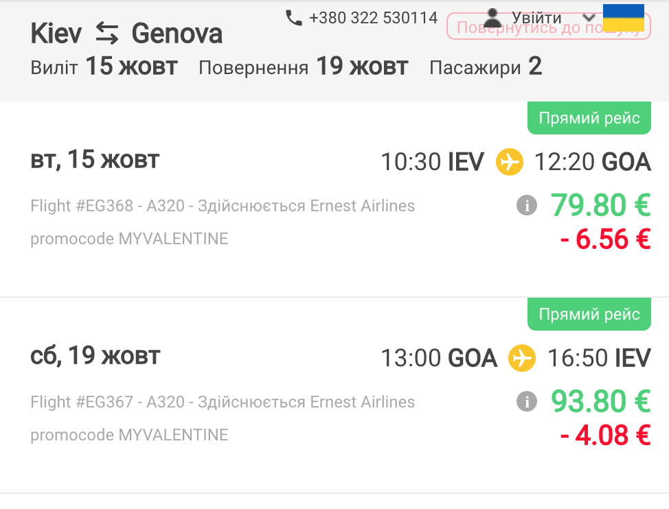 Авіакомпанія Ernest Airlines дарує знижку 20% на подорож удвох та запускає новий напрямок Київ – Генуя (Італія). Таким чином, у період акції квитки до Генуї з Києва коштуватимуть від 47 євро в одну сторону. До Генуї можемо злітати починаючи з 16 березня, а до інших італійських міст – хоч завтра, якщо дозволяє бюджет.