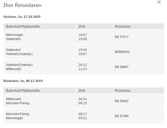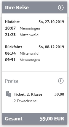 Про це ми писали в окремій статті – тут. Конкретно для цієї поїздки потрібно обрати потрібні дати та напрямок, зазначити кількість осіб (чим більше, тим дешевше цей єдиний квиток вам коштуватиме). Вкінці система запропонує вам різні економ-пропозиції. Ми обрали найдешевшу (стабільні дати, без можливості перебронювання, для двох, територія – Баварія, лише для регіональних поїздів типу RE, REB, BRB, RB).