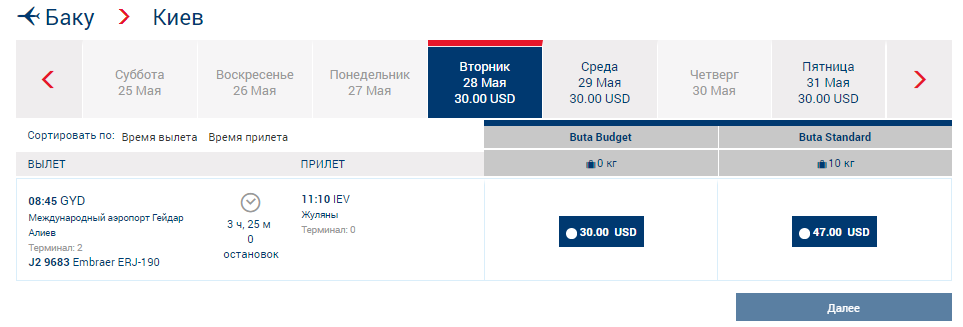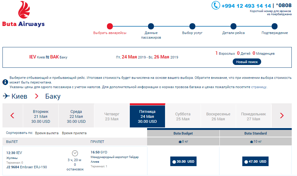Азербайджанський лоукостер Buta Airways пропонує вигідну ціну на прямі рейси Київ – Баку навесні та влітку 2019 року. Вартість квитків в одну сторону старує від 30 $. Щоправда, тут одразу слід звернути увагу на те, що до вартості мінімального квитка (базовий тариф Buta Budget) не входить перевезення ручної поклажі та багажу.