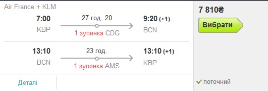 Вот скрин с сайта bravoavia: стоимость самого дешевого билета по маршруту Киев-Барселона-Киев (не обращаем внимание на удобство и время, нас интересует пока только стоимость)