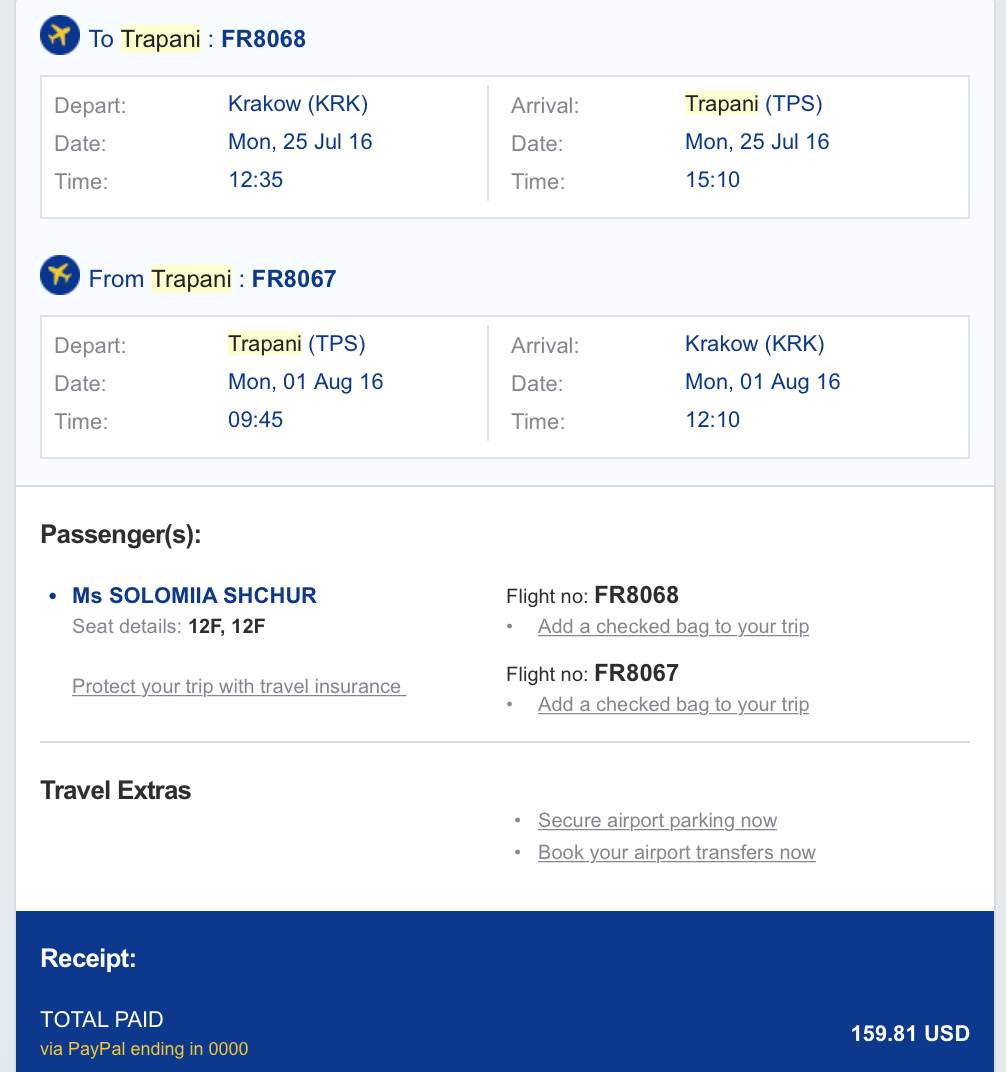 Скориставшись розпродажем авіаквитків від Ryanair, я купила квиток в обидві сторони за 150$ з Кракова за 3 місяці до дати вильоту, тобто у квітні на липень. (У сезон ціна за квиток туди і назад сягає 300 євро. Не в сезон (жовтень) можна придбати квитки і за 300 злотих (=до 2000 грн.) в обидві сторони). Платіж здійснювала з PayPal, на сайті Ryanair є така можливість.