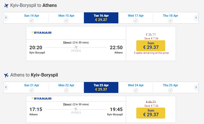 А для тих, хто бере відпустку в часі Великодня, є варіант на Афіни з Києва: