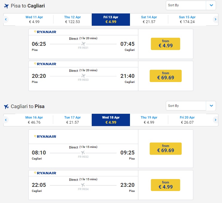 Для всіх, хто планує у квітні відвідати Пізу або Кальярі, ця інформація буде актуальною. Інший варіант – полетіти в Кальярі на 1 день, повернувшись назад пізно ввечері (це буде трохи дорожче). Такий собі “виліт за місто”, що триває всього 1 год. 20 хв.