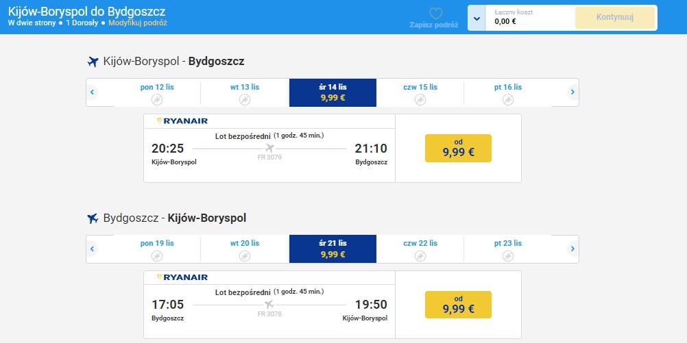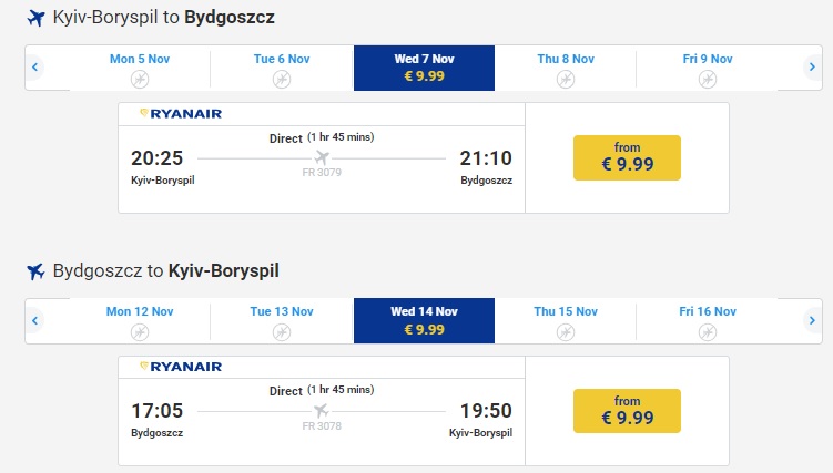 Ryanair пропонує найдешевші квитки до Бидгоща з київського Борисполя. Квитки за ціною 10 євро можна придбати на листопад.