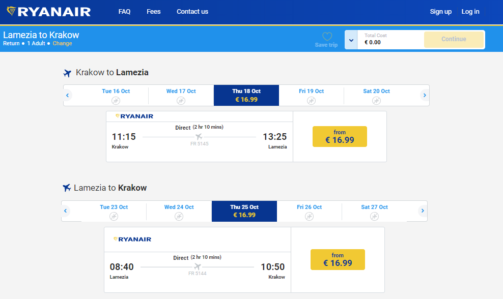 Краків – Ламеція-Терме – Краків: від 34€ / 144 zł у жовтні;