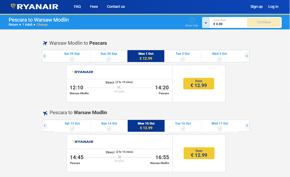 Варшава – Пескара – Варшава: від 26€ / 112 zł у жовтні;