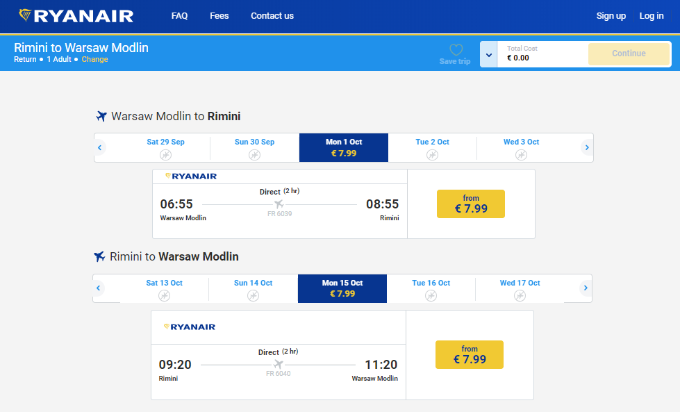 Варшава – Ріміні – Варшава: від 20€ / 68 zł у жовтні;