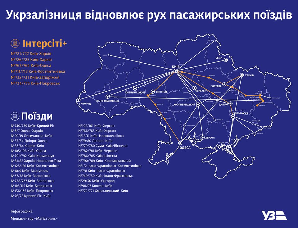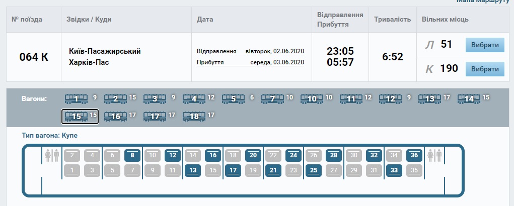 Зокрема, відкрито продаж квитків у 20 плацкартних вагонах у складі поїздів №98/97 сполученням Київ — Ковель (10 вагонів); №125/126 Київ — Костянтинівка (3 вагони), №10/9 Київ — Маріуполь (1 вагон), №102/101 Київ — Херсон (6 вагонів).