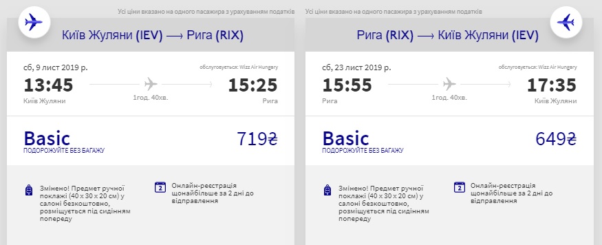 Wizz Air пропонує бюджетні авіаквитки до Риги в листопаді. Найдешевший період – 9-23 листопада, на інші дати дорожче. Це ціна для всіх. Тим, хто має знижку в рамках програми WDC, ціна в обидві сторони становить 30 євро або 760 грн.!